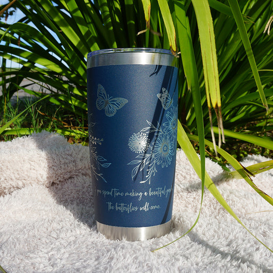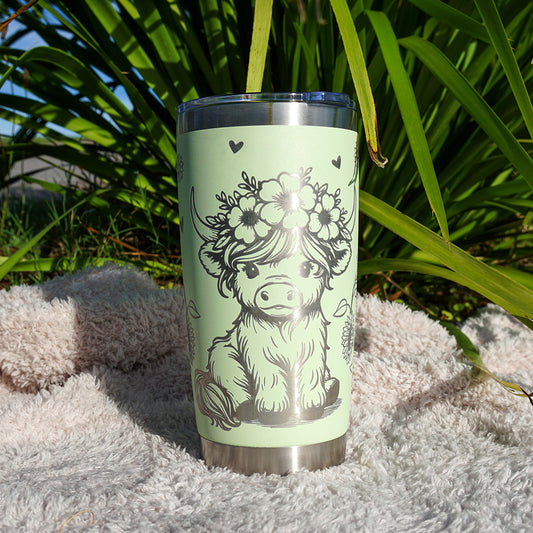 These Insualted Coffee Cups is are made from durable stainless steel with double-wall vacuum insulation to protect the temperature of your beverage at all costs. The lid slides open and closed with a magnetic slide. These Travel Tumblers have a durable powder coated surface in various colours. During the laser engraving process this powder coated layer is removed to make the unique design.