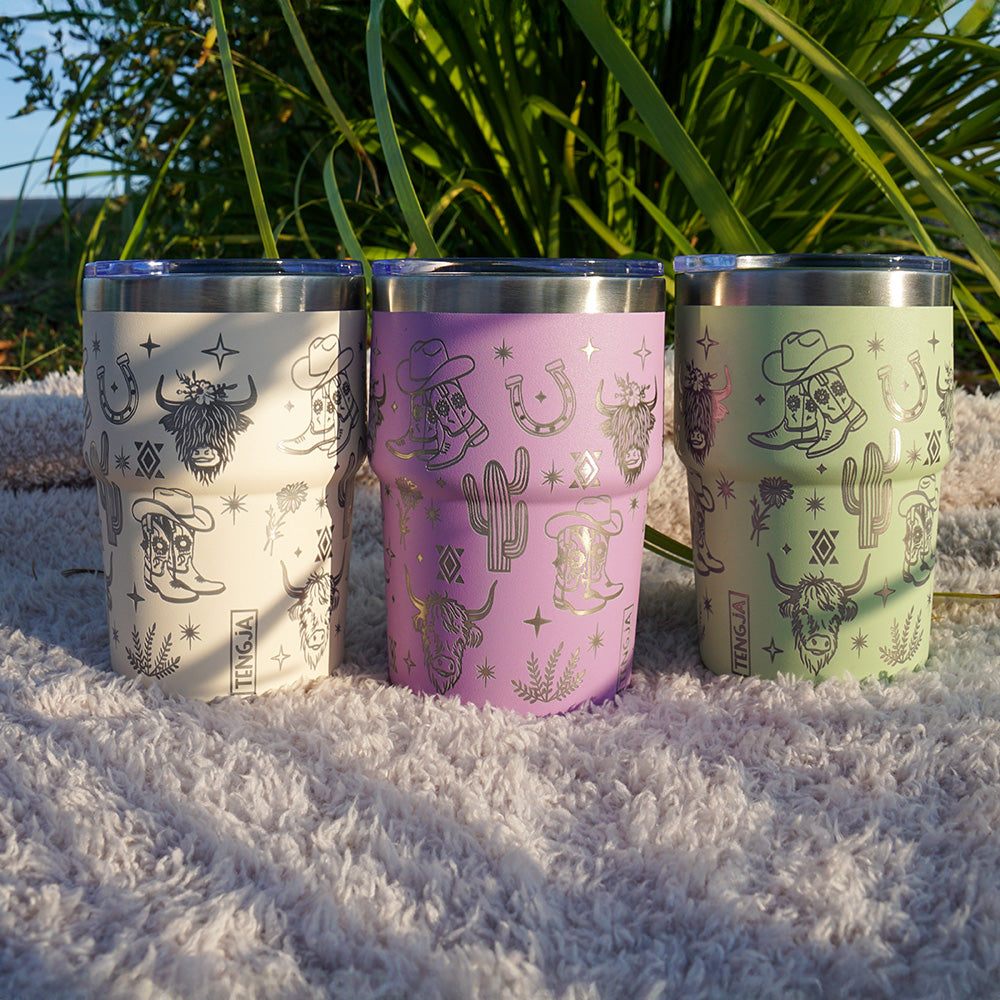 These Travel Tumblers have a durable powder coated surface in various colours. During the laser engraving process this powder coated layer is removed to make the unique design.